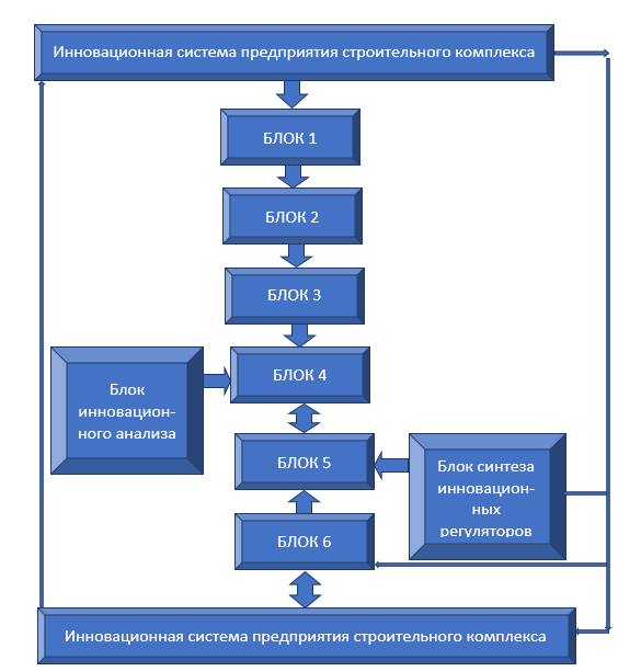 Посредством информационных обратных связей (блок инновационного анализа и блок синтеза инновационных регуляторов) цикл замыкается, образуя контур роста, «обогащения» инновационного потенциала предприятий строительного комплекса.