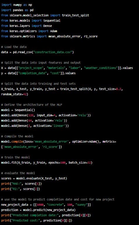 Использование алгоритмов регрессии для прогнозирования даты завершения и стоимости строительного проекта может стать ценным инструментом для менеджеров проектов, позволяющим лучше планировать и управлять своими проектами. Вот некоторые шаги, которые могут быть приняты для решения этой проблемы: