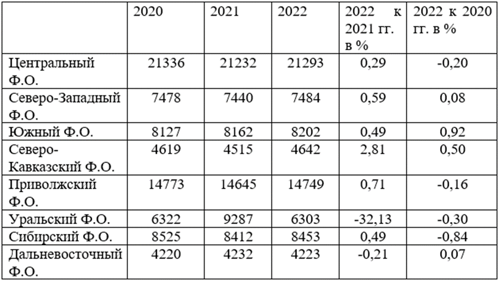 Рассматривая таблицу можно увидеть, что количество предприятий в РФ стабильно падает. Рассматривая более детально, стоит отметить, что наибольшее падение у Центрального Федерального Округа – спад на 6% по сравнению с предыдущем годом, или спад на 16% по сравнению с 2020 годом. Наибольшую стабильность показал Северо-Кавказский Федеральный Округ – спад количества организаций по сравнению с 2020 годом на 8%. Данные показатели хозяйственно-экономического фактора негативно сказывается на устойчивости региональных экономических систем РФ.