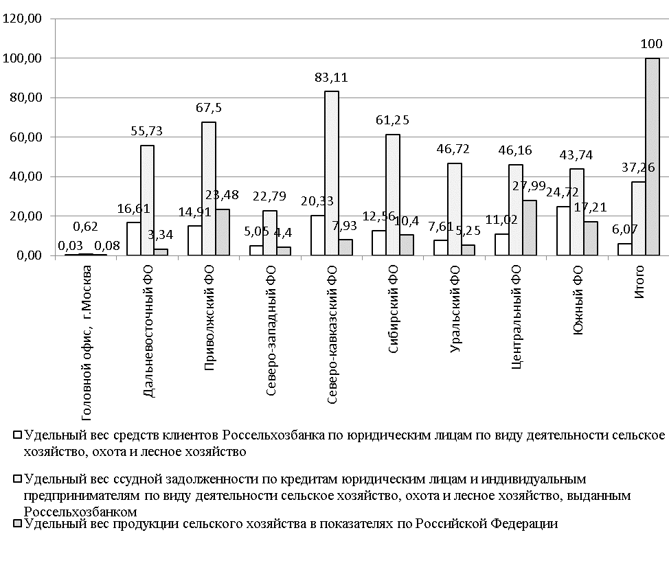 Наибольший удельный вес кредитов по виду деятельности «Сельское хозяйство, охота и лесное хозяйство» выдан в Северо-Кавказком федеральном округе – 83,11%, в объеме сельскохозяйственного производства данный округ занимает 7,93%. Наибольший удельный вес клиентов по виду деятельности «сельское хозяйство, охота и лесное хозяйство» обслуживается в Южном федеральном округе – 24,72% клиентов, при этом удельный вес производства сельскохозяйственной продукции в данном федеральном округе также высокий – 17,21%. Наибольший удельный вес в производстве сельскохозяйственной продукции занимает Центральный федеральный округ – 27,99%, при этом удельный все кредитов сельскохозяйственным производителям и количество клиентов, занимающихся этим видом деятельности здесь ниже.