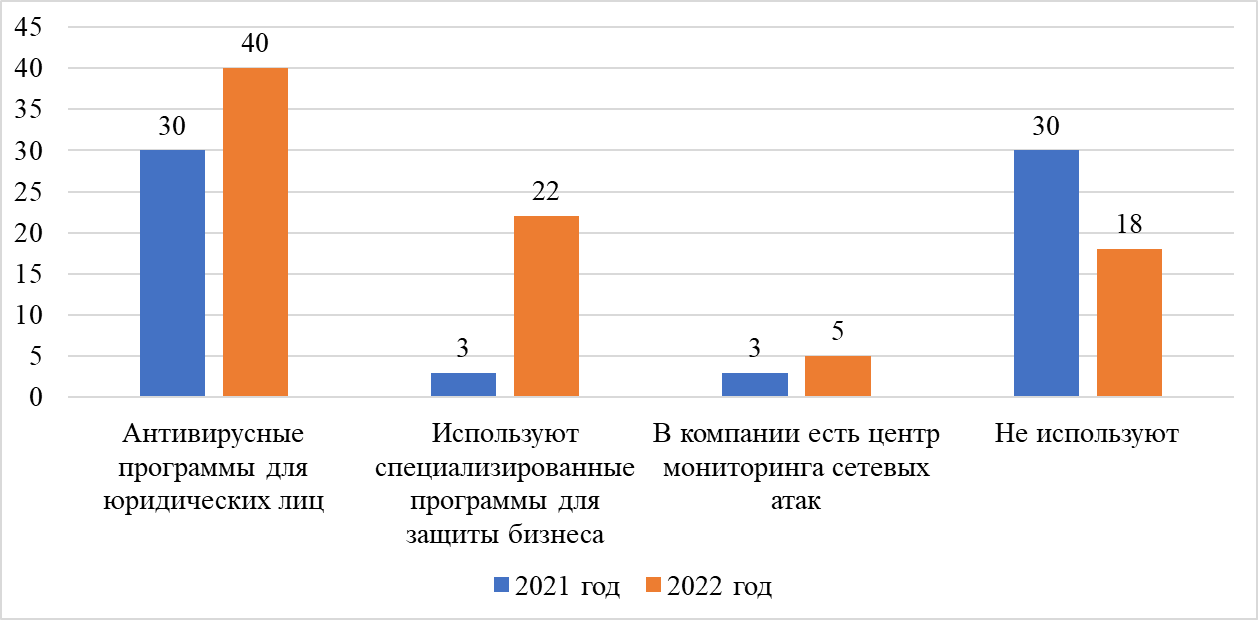 С увеличением масштабов внедрения цифровых технологий компании стали активнее погружаться в вопрос обеспечения безопасности данных (рис.4). По сравнению с осенью 2021 год наблюдается рост интереса к использованию антивирусных программ для юридических лиц (40%), специализированных программ для защиты бизнеса (22%). На 12 п.п. снизилась доля компаний, не использующих защиту данных. В московских компаниях существует больше центров мониторинга сетевых атак (11% против 4% в регионах), региональные компании значимо чаще используют антивирусные программы для физических лиц (46%).