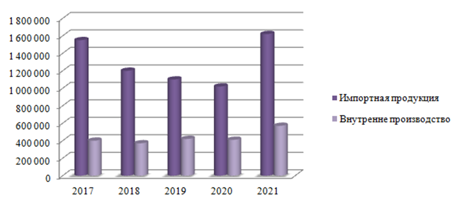 Рисунок 1 - Сравнение собственного производства и импортной продукции на российском рынке сельхозтехники в 2017-2021 гг., шт. [4]