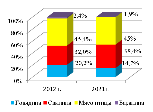 Тенденции снижения поголовья крупного рогатого скота, в том числе коров, предопределили структурные сдвиги в формировании мясных ресурсов Российской Федерации. Если в 2012 году на долю говядины приходилось 20,2 % от общего объема производимого мяса, то в 2021 г. ее доля составила 14,7 % от всей продукции мясного животноводства (рисунок 2). Сейчасговядина по своей значимости занимает 3 место на рынке мяса России.