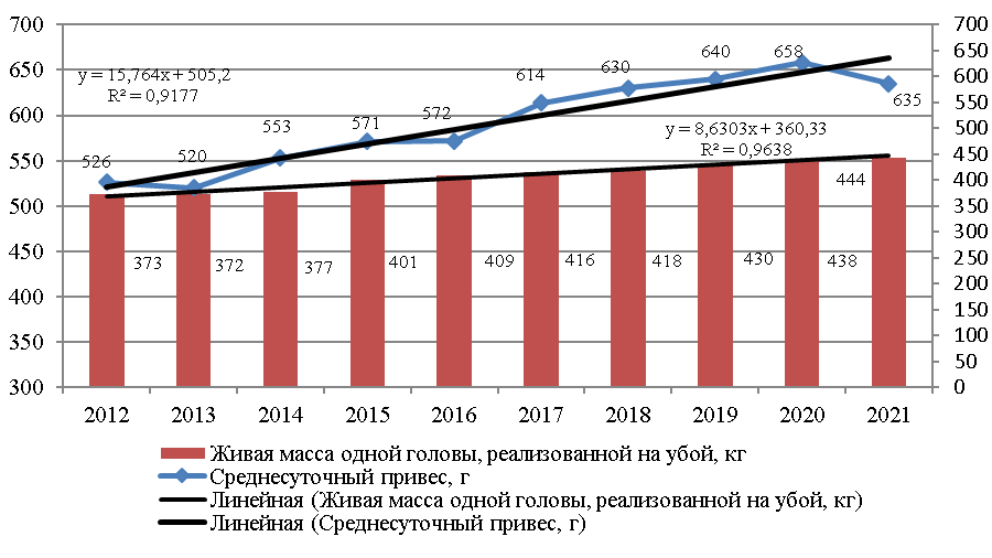 В 2012 году около 90 % говядины получали от поголовья молочного скота. При этом среднесуточные приросты на выращивании, откорме и нагуле составляли 526 г., а средняя живая масса скота, реализованного на убой, составляла 373 кг. Важной тенденцией стало ежегодное увеличение среднесуточных привесов в среднем на 15,7 г. В 2021 году этот показатель составлял 635 г. Повышается также и средняя живая масса одной головы, реализованной на убой. За 10 лет он увеличился на 71 кг и составил в 2021 г. 444 кг. (рисунок 3).