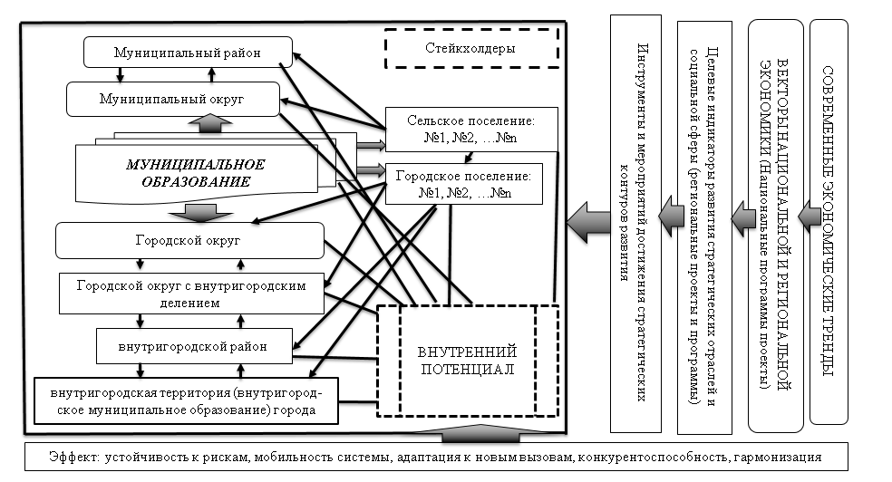 По нашему мнению, современное МО представляет собой комплексную социально-экономическую систему, которая ограничена территориально, обладает внутренним потенциалом, способным под регуляторным воздействием обеспечить ее устойчивость к новым вызовам, поступающим из вне, гарантировать ее поступательное развитие в целях удовлетворения потребностей проживающих граждан, а также достижение региональных целей стратегического назначения.