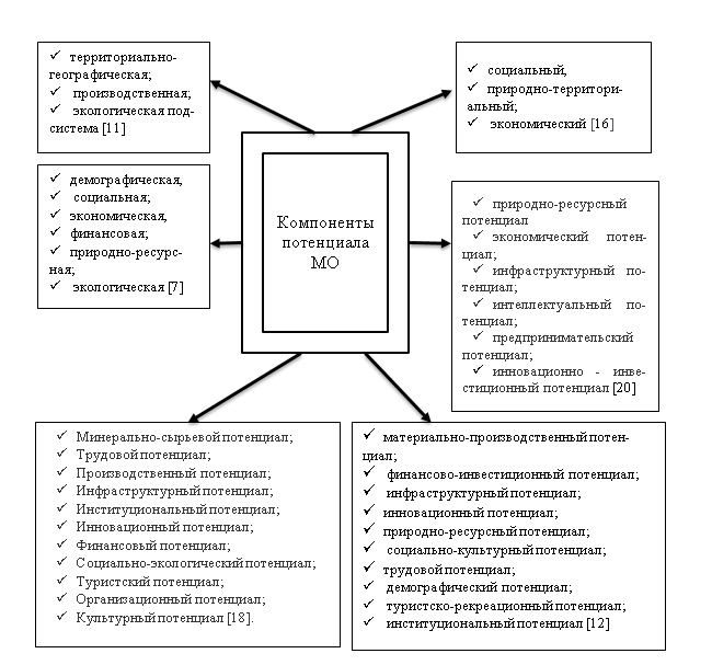 Как видим, в настоящее время встречаются различные подходы к структурированию потенциала МО через призму системообразующих элементов. Причем, одни авторы укрупненно систематизируют структурные подсистемы, а другие максимально детализируют, что на наш взгляд является не совсем объяснимым и приводит к необходимости конкретизации входящих компонент.