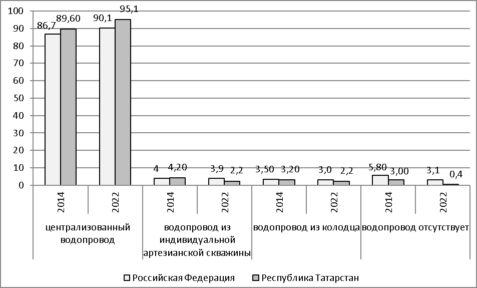 Благоустроенность жилья характеризуется наличием отопления, водопровода, газа, связи и т.д. В Республике Татарстан централизованным водопроводом обеспечено 95,1% домохозяйств, за исследуемый период данный показатель возрос на 5,5 п.п., т.е. более высокими темпами, чем по Российской Федерации (3,4 п..п.), однако в регионе остались домохозяйства, в жилищах которых водопровод отсутствует – 0,4%.