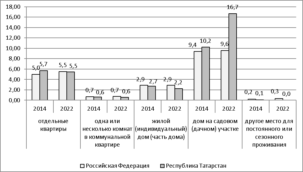 Заключение. Анализ показал положительную динамику изменения показателей по улучшению жилищных условий населения Республики Татарстан и выполнения принятых нормативных документов по данной проблеме. Сравнительная оценка жилищных условий домохозяйств Республики Татарстан со среднероссийскими показателями показала, что население республики имеет меньшую стесненность жилищных условий, более высокий уровень обеспеченности жилищ водопроводом и отоплением, что говорит о хороших жилищных условиях для домохозяйств. Среди других видов жилых помещений преобладают дома на садовых (частных) участках.