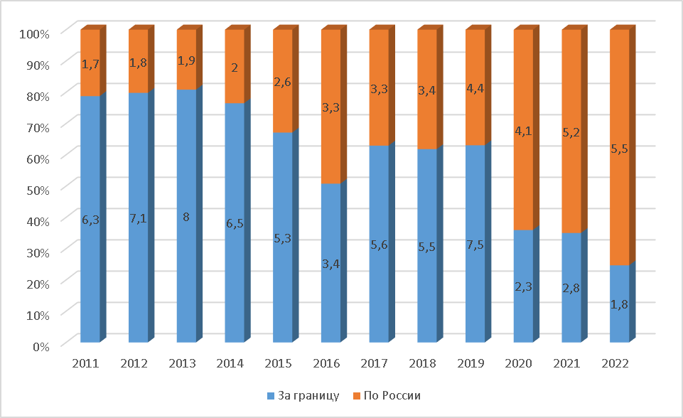 Однако, не только организованный туризм показал высокие результаты в 2022 г. Реализация национального проекта «Туризм и индустрия гостеприимства» позволили достичь общего количества туристических поездок россиян, превышающего 100 млн. ед. Причем, более 77 млн. поездок были внутри России (рис. 3).