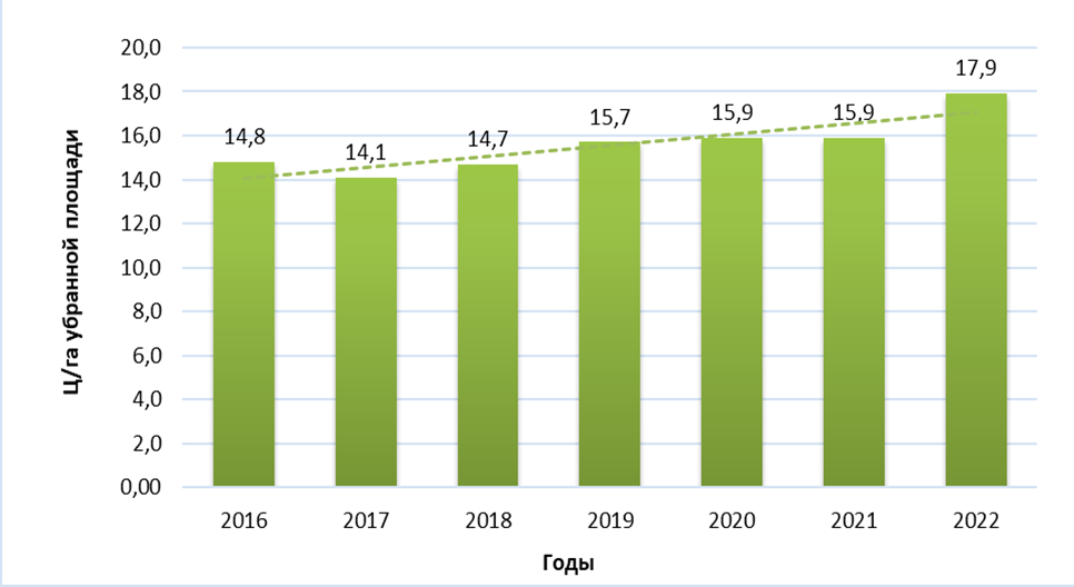 Fig. 3. Soybean yield in farms of all categories in the Russian Federation for the period from 2016 to 2022