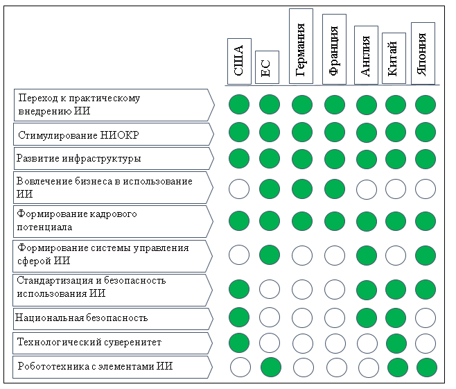 Странами-лидерами в разработке различных законодательных инициатив по развитию и поддержке искусственного интеллекта выступаю США, Китай, Франция, Германия, Великобритания и Япония, которые через различные программы и нормативные акты последовательно реализовали и совершенствуют четыре основных блока: во-первых, переход к практическому внедрению и использованию ИИ, во-вторых, активное стимулирование НИОКР в области ИИ, в-третьих, поддержка формирования и расширение соответствующей инфраструктуры, в-четвертых, подготовка кадров и развитие научной среды.
