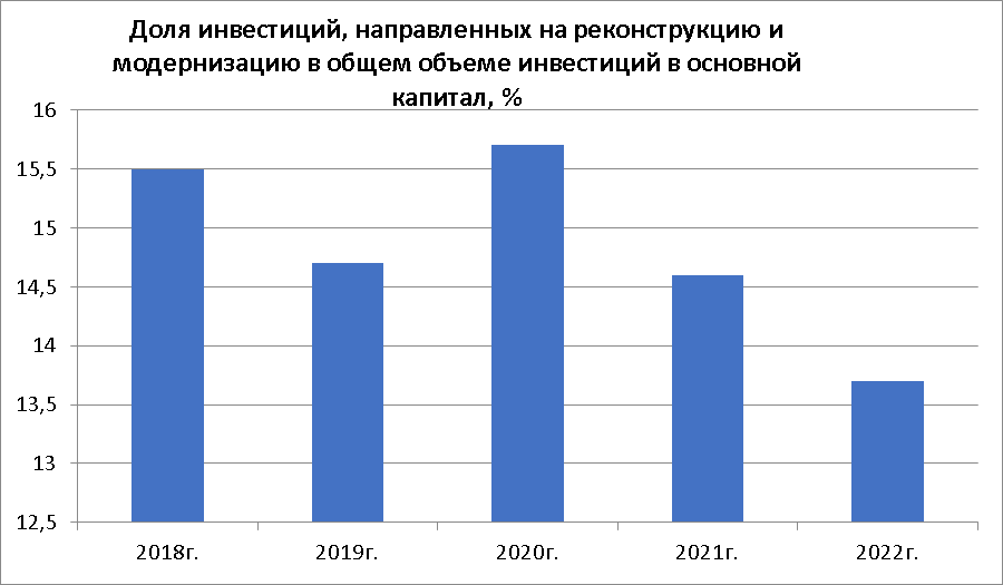 В РФ с 2018-2022гг. доля инвестиций, направленных на реконструкцию и модернизацию, в общем объеме инвестиций сократилась в 1,13 раза (рисунок 4), что свидетельствует о ранее упомянутом факте о незаинтересованности предприятий в инновационном росте производства.