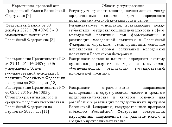 В таблице 1 отражены нормативно-правовые акты, регулирующие молодежное предпринимательство в РФ