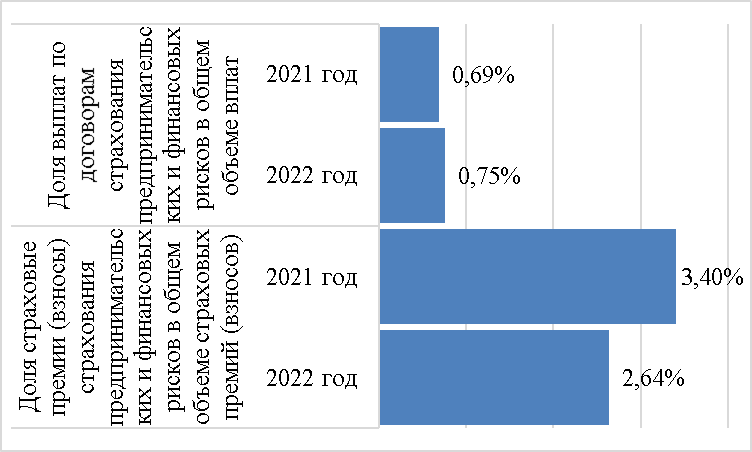Согласно официальным статистическим данным доля страховых премий по страхованию предпринимательских, в т.ч. финансовых рисков составляет не более 2,64% от общего объема собранных премий по добровольному и обязательному страхованию в 2022 году, против 3,40% в 2021 году. Снижение доли страхования предпринимательских рисков более чем на 20% связано с увеличением выплат по договорам страхования с 9% в 2021 году, 14% в 2022 году, которое прежде всего обусловлено экономическими и политическими катаклизмами 2022 года и их отдаленными последствиями, также необходимо отметить, что в 2021 году особое влияние на организацию предпринимательской деятельности оказывало распространение Covid-19, в том числе в качестве страхуемых рисков страхователями предлагалось заболевание этим вирусом [8]. Также в 2022 году сократились страховые премии по всем видам добровольного страхования, кроме имущественного и сельскохозяйственного, что обусловлено особенностями работ предпринимателей в новых санкционных условиях и ослаблении ограничений, связанных с противодействием распространению заражений коронавирусной инфекцией.
