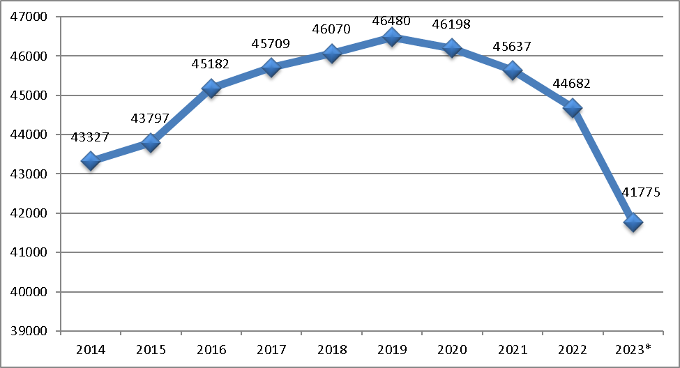 Рисунок 1. Динамика общей численности пенсионеров, тыс. человек