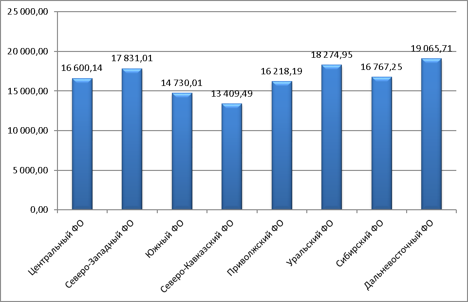 Рисунок 2. Средний размер пенсионного обеспечения в федеральных округах, руб. [6]