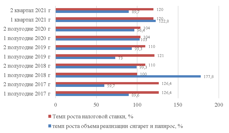 Рисунок 3- Сопоставление налоговой ставки и объема реализации папирос и сигарет в РФ