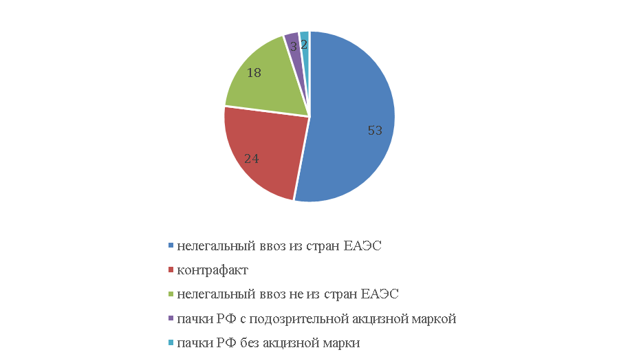 По данным экспертов, рост объема продаж нелегальных сигарет происходит по мере удаленности от крупных городов. Для примера, в крупных центрах этот показатель составляет 12,2%, а в малых населенных пунктах- свыше 15%. Причем, наибольший удельный вес контрафактных сигарет приходится на ввоз из стран ЕАЭС- свыше 50% (рис.5).