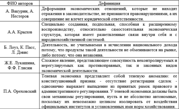 Исследуя взаимосвязь коррупции и теневой экономики, необходимо рассмотреть подходы различных авторов, отраженные в таблице 2, к определению понятия «Теневая экономика».