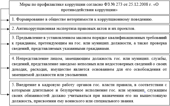 В настоящее время в России действует Федеральный закон № 273 от 25.12.2008 г. «О противодействии коррупции», который включает в себя ряд мер по профилактике коррупции, отраженных на рисунке 2.