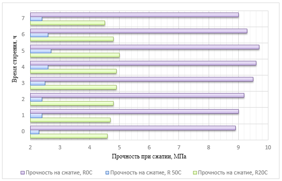 Полученные результаты показывают, что экстремум прочности асфальтобетонов при температурах старения 50°С, 20°С и 0°С соответствует 5 часам испытаний. Тенденция изменения коэффициента старения от точки экстремума для разных температурных условий показывает, что при температуре 50°С в течение последующих 2 часов коэффициент старения изменяется на 0,15 единиц, при 20°С на 0,08 единиц, при 0°С на 0,03 единицы.