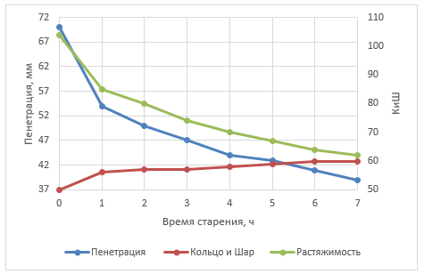 В результате установили изменения физико-механических свойств битума: пенетрации при 25°С, температуры размягчения, дуктильности (растяжимости) битума от времени состаривания АБС. Полученные экспериментальные данные приведены на Рис. 4.