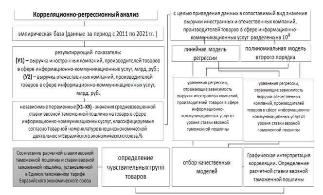 Важность таможенно-тарифного регулирования определяется рядом причин. Здесь, как правило, выделяют защиту внутреннего рынка, регулирование внешней торговли, фискальную функцию, обеспечение безопасности, стимулирование и развитие смежных отраслей. Все они актуальны для проведённого исследования. В настоящей статье изложен и проиллюстрирован авторский методический подход к таможенно-тарифному регулированию импорта товаров в сфере ИКУ, включающий четыре этапа реализации, на каждом из которых обоснована необходимость верификации гипотез с применением инструментов оценки данных государственной таможенной статистики, сбора и обработки эмпирических данных, а также построения эконометрических моделей, что позволит обеспечить равно конкурентный характер действующего уровня тарифного обложения импорта, развитие отечественного производства и смежных отраслей. На основании предложенного подхода к определению ставок таможенных пошлин разработан порядок расчёта эффекта от изменения ставок ввозных таможенных пошлин с применением скорректированного таможенного тарифа, который позволяет рассчитать потери доходной части федерального бюджета при современном уровне ставок, что дополняет существующий порядок расчёта с учётом изменения бюджетных поступлений.