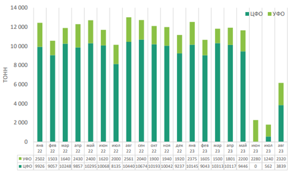 Рисунок 5 – Динамика производства лизина в Российской Федерации (2022 – 2023 г.г.), т