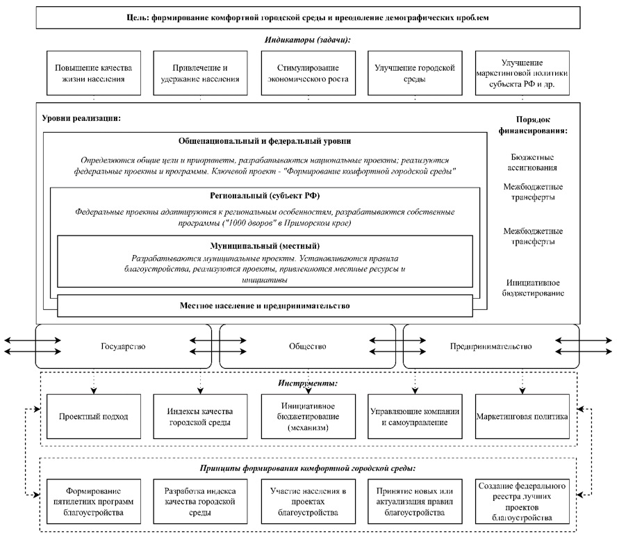 Подчеркнем, что на современном этапе отсутствует общепринятое понятие городской среды, что по мнению О.В. Нотман [7] является результатом сложности и многосторонности городской среды. Указывая на междисциплинарность понятия, автор замечает, что городская среда заключает в себе элементы урбанистики, экологии, социологии и экономики. Аналогичной позиции по вопросам городской среды и её определения придерживается Л.М. Геложина [8], которая рассматривает городскую среду как совокупность факторов и условий проживания населения на определенной территории, которые складываются из указанных областей, формируя междисциплинарность городской среды. Однако более ясными являются определения понятий «территория общего пользования» и «дворовая территория», которые являются образующими комфортную городскую среду элементами. Территории общего пользования, согласно ст. 1, п. 12 Градостроительного кодекса Российской Федерации – это «территории, которыми беспрепятственно пользуется неограниченный круг лиц (в том числе площади, улицы, проезды, набережные, береговые полосы водных объектов общего пользования, скверы, бульвары)» [9]. В то время как под дворовой территорией понимается «совокупность территорий, прилегающих к многоквартирным домам, с расположенными на них объектами, предназначенными для обслуживания и эксплуатации таких домов, и элементами благоустройства этих территорий, в том числе парковками (парковочными местами), тротуарами и автомобильными дорогами, включая автомобильные дороги, образующие проезды к территориям, прилегающим к многоквартирным домам» [10]. Так, по мнению О.А. Петриной и М.Е. Стадолина [11], организация комфортной городской среды является общенациональной проблемой, характерной для различных субъектов РФ и отражающей снижение качества благоустройства, что особенно сильно проявляется на «местном» уровне при недостатке финансирования. Муниципальные образования не способны формировать комфортную городскую среду собственными усилиями, поскольку перед ними встает вопрос о реализации ресурсов на ремонтно-восстановительные работы, а не создание новых качественных объектов и инфраструктуры. В тоже время, авторы выделяют значение и перспективность реализуемого проекта по формированию комфортной городской среды, который реализуется с учетом системы авторских принципов.