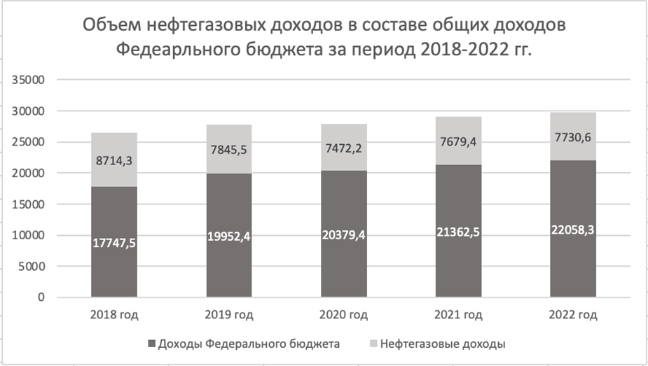 Рисунок 1. Динамика изменения части нефтегазовых доходов в составе доходов федерального бюджета страны за период 2018-2022гг., млрд.руб.