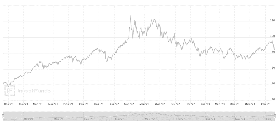 Рисунок 2. Динамика цены нефти марки Brent за период 2020-2023гг.