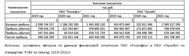 Для анализа были выбран лидеры нефтегазовой отрасли – компания ПАО «Роснефть» и ПАО «Лукойл». Данные компании были выбраны благодаря тому, что имеют большую географию функционирования и лидерские доходы отрасли. На основе этого можно сделать вывод о том, что эту практически единственные претенденты, которые могли не реагировать на мировые проблемы и устоять во время экономического напряжения в мире. Были проанализированы основные показатели прибыли, которые представлены в таблице. Данные различных видов прибыли были выбраны благодаря тому, что данные показатели несут в себе демонстрацию экономической активности компаний, ее способность оплачивать обязательства и оставаться финансово привлекательной. Также временной интервал исследования – 2019 - 2021 гг., так как именно этот период демонстрирует зависимость компаний нефтегазовой отрасли от экономической и политической ситуации страны.