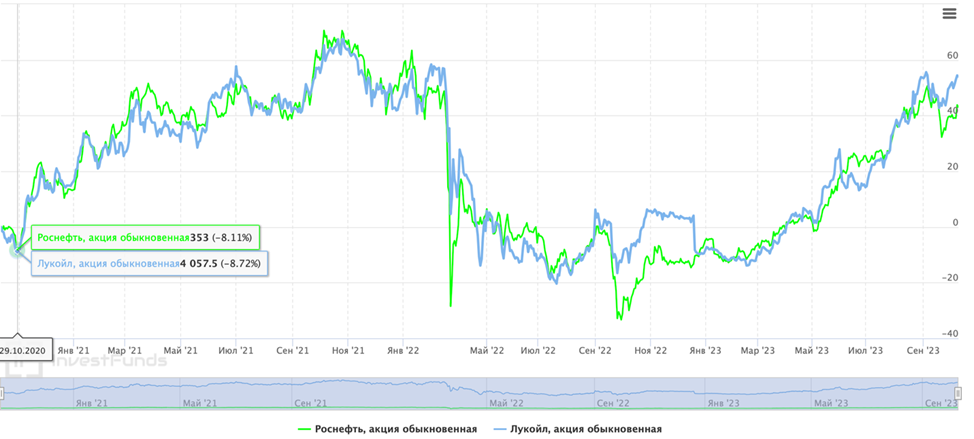 Рисунок 3.Динамика цен акций ПАО "Роснефть" и ПАО "Лукойл"