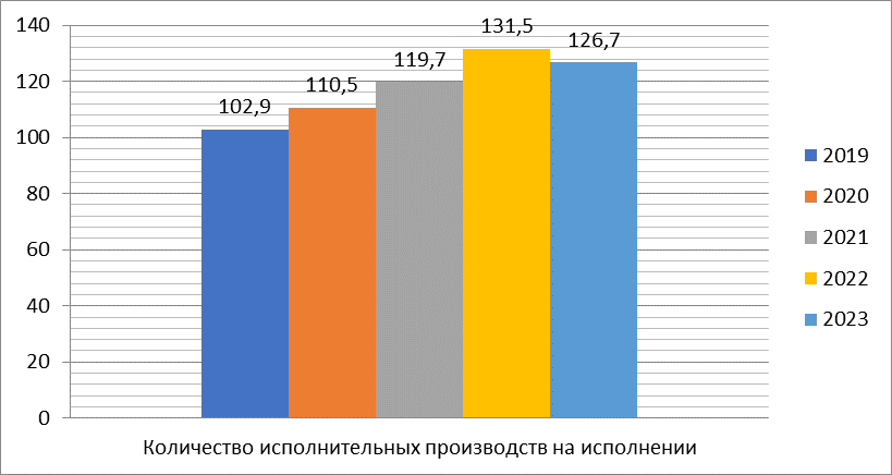 Наибольшее значение показатель принимает в 2022 году, тогда на исполнении было 131,5 млн. исполнительных производств. В 2023 году показатель снизился до 126,7 млн. производств.