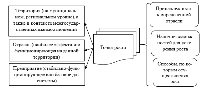 Раевский С. и Исаченко Ю. отмечают, что под «региональной точкой роста, как локальной пространственной зоны экономической активности, следует понимать крупное предприятие конкретной отрасли или совокупность хозяйствующих субъектов в рамках определенной территории, обладающих существенным потенциалом саморазвития и способных обеспечить высокую динамику экономического роста в регионе». Причем, выделяют видовые особенности точек роста и их признаковые характеристики (рис.1).
