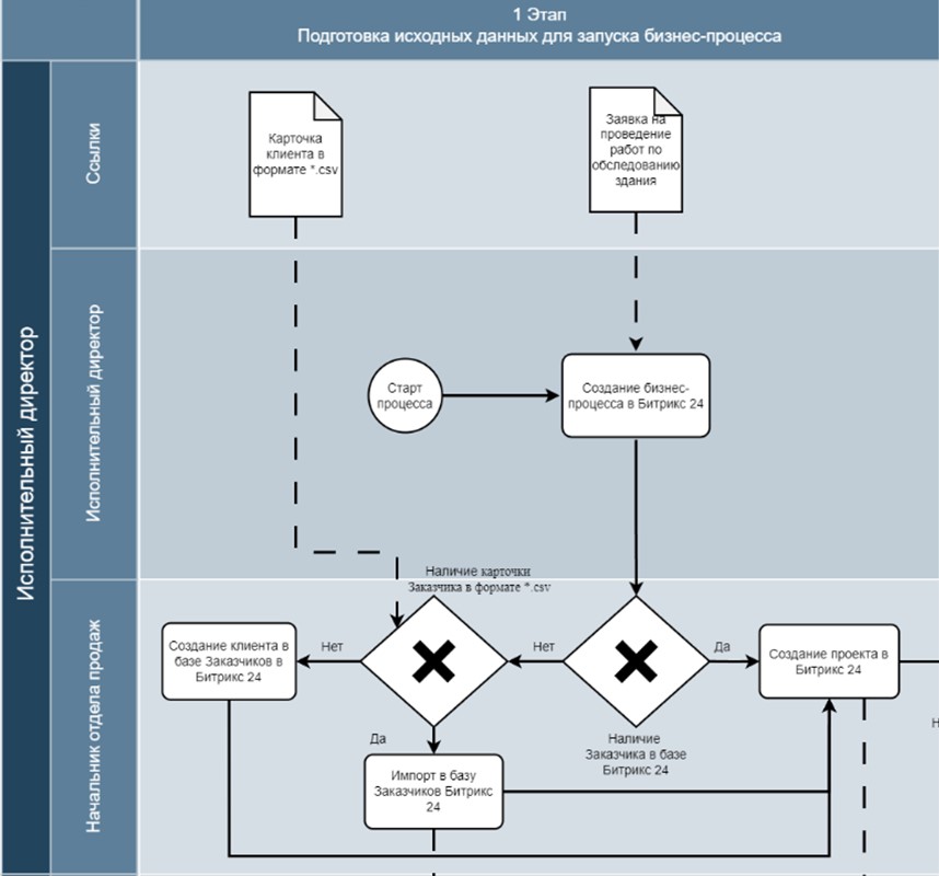 Этап 1. Подготовка исходных данных для запуска бизнес-процесса начинается с подачи заявки исполнительному директору для проведения работ. Эта заявка будет выступать в роли входных данных. Исполнительный директор запускает процесс в Битрикс 24 и назначает задачи начальнику отдела продаж. Начальник отдела, при обработке заявки, определяет наличие заказчика в базе клиентов CRM. При наличии данных, он выбирает клиента и создает проект. При их отсутствии, происходит импорт карточек клиентов в формате *.csv. Остальные форматы для автоматического импорта не поддерживаются. В случае отсутствия данных, информация вводится вручную и создается проект (Рис. 1).