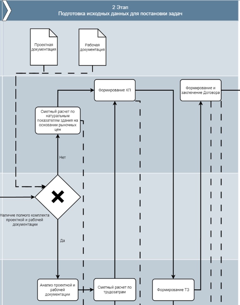 Этап 2. Подготовка исходных данных для постановки задач. После создания проекта в Битрикс 24 необходимо составить сметный расчет, который возможен на основании проектной и рабочей документации. Если такая документация присутствует, ее предварительно анализирует технический директор для определения конструктивного решения здания и трудозатрат. На основании этого формируется коммерческое предложение и техническое задание. При отсутствии документации сметный расчет выполняется по натурным показателям и рыночным ценам по обследованию аналогичных зданий. Завершающим шагом этапа является формирование и подписание договора. Входные данные: проектная и рабочая документация. Выходные данные: коммерческое предложение, техническое задание, договор и актуализация проекта в Битрикс 24 (Рис. 2).