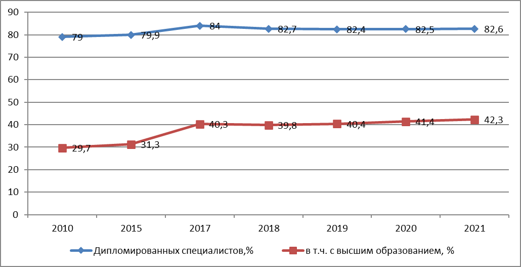 Рис. 7. Уровень обеспеченности потребности в кадрах дипломированных специалистов, %