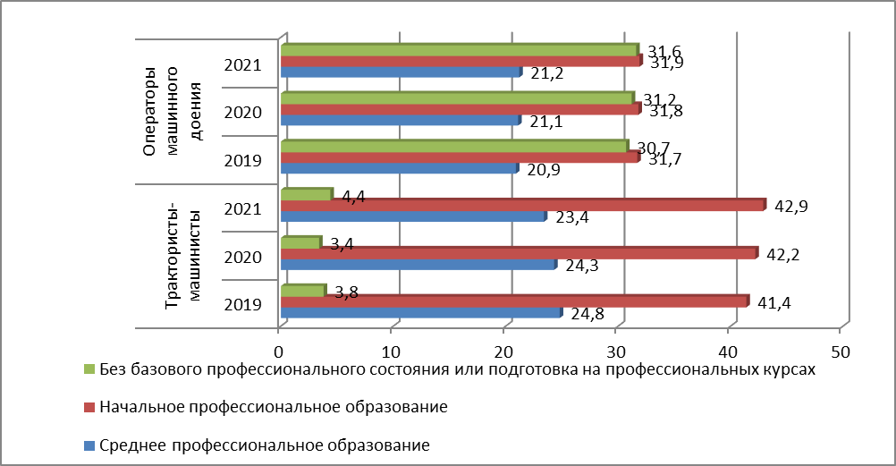В 2021 году 4,4% трактористов-машинистов, и 31,6% операторов машинного доения не имели базового профессионального образования и подготовки на профессиональных курсах, что на 0,9 и 06 % соответственно меньше уровня 2019 года (Рис. 11). 42,9% трактористов-машинистов и 31,9% операторов машинного доения имели начальное профессиональное образование, что на 0,2 и 1,5% выше уровня 2019 года. 23,4% трактористов-машинистов (-1,4 п.п. к уровню 2019 года) и 21,2% операторов машинного доения(+0,3 п.п. к уровню 2019 года) имели среднее профессиональное образование.