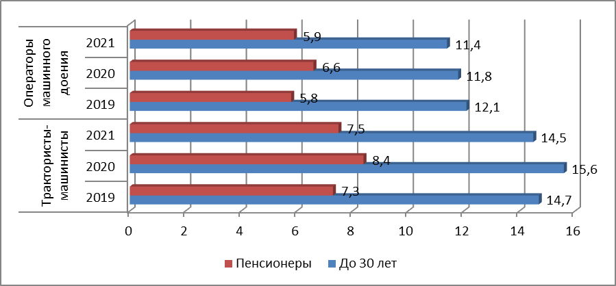 Аналогичная тенденция отмечается по рабочим массовых профессий - трактористам машинистам и операторам машинного доения. Как наглядно свидетельствуют данные представленные на рисунке 8, за период 2019-2021 гг. численность трактористов-машинистов снизилась на 338 чел или на 7,4%, операторов машинного доения – на 50 чел. или 15,9% (Рис. 10).
