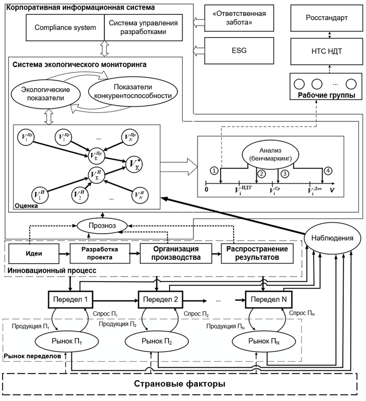 Применение системы экологического мониторинга позволит производить оценку консолидированного экологического эффекта инноваций на всех этапах инновационного процесса: от формирования идеи через разработку проекта и организацию производства до распространения результатов. Оценка будет складываться из эффекта от производства, так и эффекта от использования продукции в рамках всей производственной цепочки переделов. Она будет производиться на основе наблюдения за ситуацией на рынках химической продукции, процессами реализации переделов, а также изменениями страновых факторов. Экологические показатели инноваций непосредственно будут оказывать влияние на показатели конкурентоспособности предприятий-инноваторов.