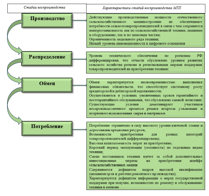 Поскольку стадия производства является приоритетной для эффективности воспроизводственного процесса, то сдерживающие и суженные темпы воспроизводства в рамках этой стадии отражаются на последующих стадиях воспроизводственного процесса. Общая характеристика стадий воспроизводственного процесса свидетельствует о наличии системных проблем в вопросах воспроизводства МТП, что с нашей точки зрения является сдерживающим условием достижения технико-технологического суверенитета.