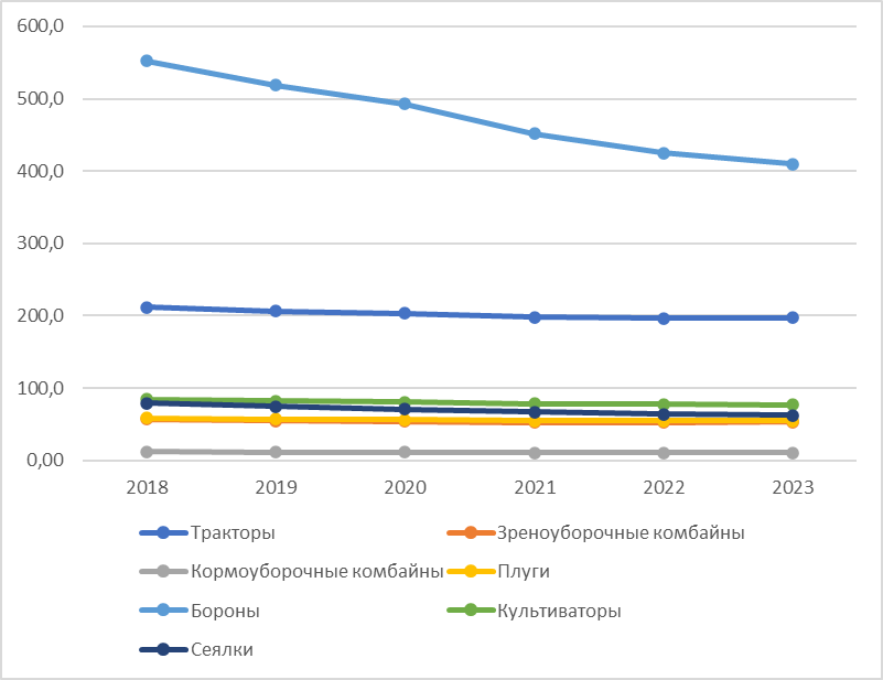 Официальные данные государственной статистики свидетельствуют о стабильной динамике сокращения парка, так на конец 2023 года парк тракторов в сельскохозяйственных организациях составил 197,6 тыс. штук, что на 36,32% меньше этого показателя в 2010 году, это свидетельствует о суженной характеристике воспроизводства, при которой темпы выбытия опережают темпы обновления парка техники, что сдерживает переход современного сельского хозяйства на уровень технико-технологического суверенитета.