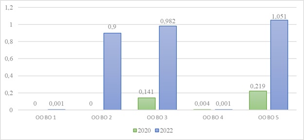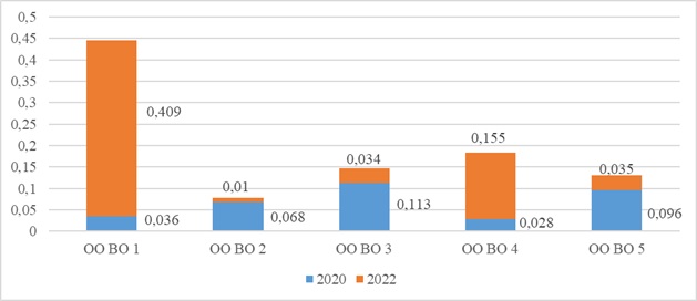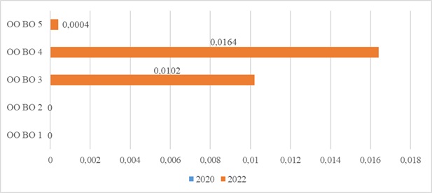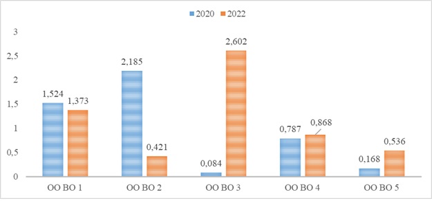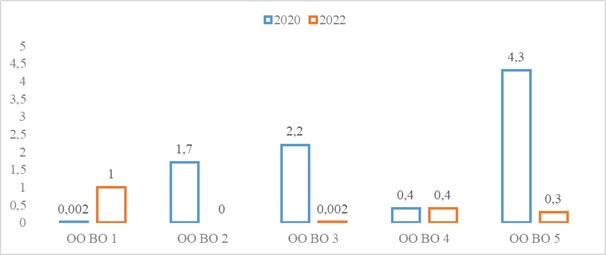 За 2020 год контрольно-ревизионными проверками наибольший объем переплаты (ущерба) закупок товаров (работ, услуг) выявлен в ОО ВО 4 и составляет 0,787% от общего объема финансирования данной образовательной организации, а наименьший ущерб в 0,084% выявлен в ОО ВО 3. Контрольно-ревизионными проверками за 2022 год наибольший объем переплаты (ущерба) закупок товаров (работ, услуг) выявлен в ООВО 3, что составляет 2,602% от общего объема финансирования данной образовательной организации, наименьший объем переплаты 0,536% в данный период выявлен в ОО ВО 5.