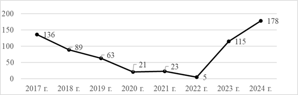 В дополнение к этому ожидаемый новый национальный проект «Кадры», который стартует в 2025 г., будет прорабатывать новые логистические схемы и новые форматы регулирования миграционных потоков. Например, считается, что иностранные трудовые мигранты, имеющие патент, более конкурентоспособны, т.к. имеют шансы быстрее интегрироваться в экономику [2].Соответственно, государственная миграционная политика была вовремя скорректирована, рост миграции в страну восстановлен с 2022 г., и в настоящее время приток трудовых мигрантов превысил уровень 2017 г.