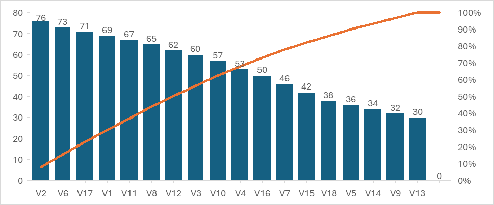 Во-первых, анализ Парето был применен в этом исследовании, поскольку он может независимо отделять жизненно важные переменные от тривиальных без попарного сравнения. Это также широко используемый и простой в применении инструмент, который ранее применялся во многих подобных исследованиях.