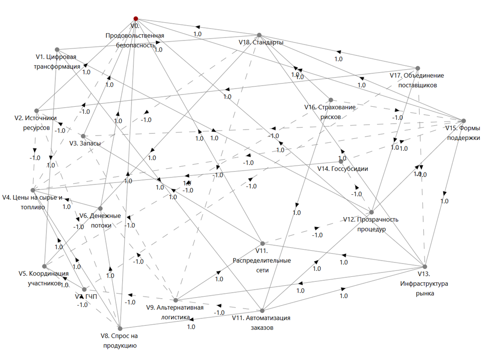 Факторы, способствующие преодолению их в ЗЦСЦ еще не изучены в полной мере, поэтому данное исследование было направлено на использование знаний о волновых эффектах и последующее выявление, расстановку приоритетов и описание взаимосвязей между факторами с использованием комбинации анализа Парето, методов TISM и когнитивного моделирования. Благодаря комплексной оценке литературы выявлено 18 факторов, способствующих продовольственной безопасности цепочек зерна. Что, в свою очередь, позволило на основе проведения анализа Парето выявить 13 значимых, прошедших уровневую кластеризацию посредством методов TISM и MICMAC. Формализованные контекстные связи между факторами, способствующими экономической продовольственной безопасности, были протестированы когнитивной имитационной моделью. Результаты исследования показали, что цифровая, управление денежными потоками для предотвращения кризиса ликвидности, реконфигурация распределительной сети для улучшения и формирование устойчивых объединений поставщиков являются пятью наиболее значимыми факторами, которые должны стать основой для разработки программ управления продовольственной безопасностью.