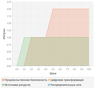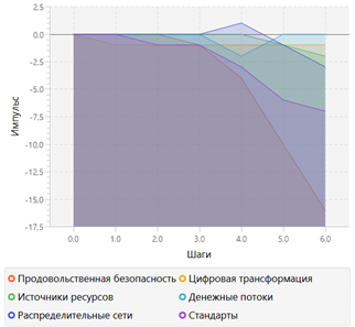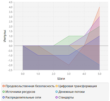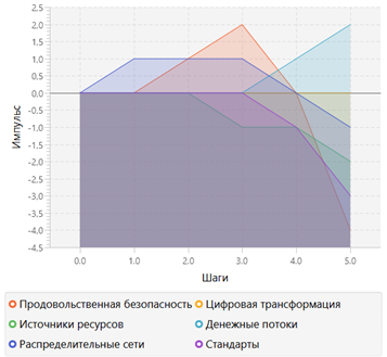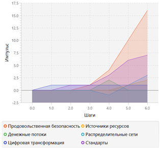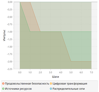 Понижение параметра источников ресурсов окажет в 2,5 раза большее влияние уровень продовольственной безопасности в целом и снизит скорость цифровой трансформации всего за 7 итераций, следовательно данный параметр требует оптимизации |