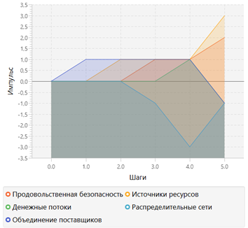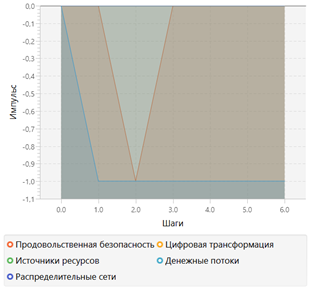 Управление параметрами денежных потоков окажет сильное на продовольственную безопасность как при снижении потоков, так и при увеличении денежных потоков, за два шага ликвидность критически изменяется отрицательно или положительно |