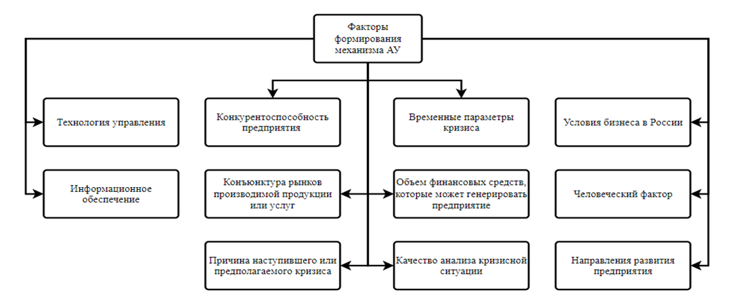 Основными факторами, влияющими на создание механизма антикризисного управления, являются: «конкурентоспособность предприятия; временные параметры кризиса; объем финансовых средств, которые предприятие может генерировать как из собственных, так и из заемных источников; качество анализа кризисной ситуации; конъюнктура рынков производимой продукции или услуг, на которые может выйти предприятие при диверсификации производства; причина наступившего или предполагаемого кризиса; условия ведения бизнеса в России; человеческий фактор; направления развития предприятия; технология управления; информационное обеспечение» [13] (рис. 4).